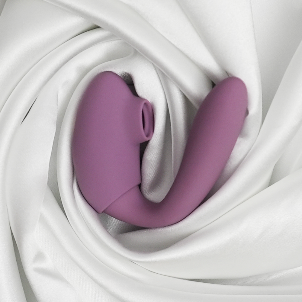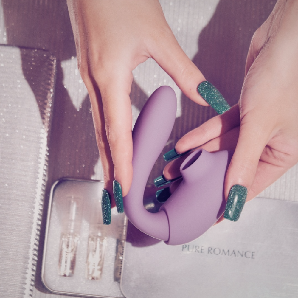 Luxe accents, air pressure, and G-spot stimulation come together in a feast for the senses. Let the insertable end tantalize with your choice of vibration speeds and patterns as the massager curves to nestle against your favorite pleasure point. Leave the sleeve on to surround your clitoris with gasp-worthy air pressure or remove it for thumping, pulsing clitoral stimulation. Which will you love more?